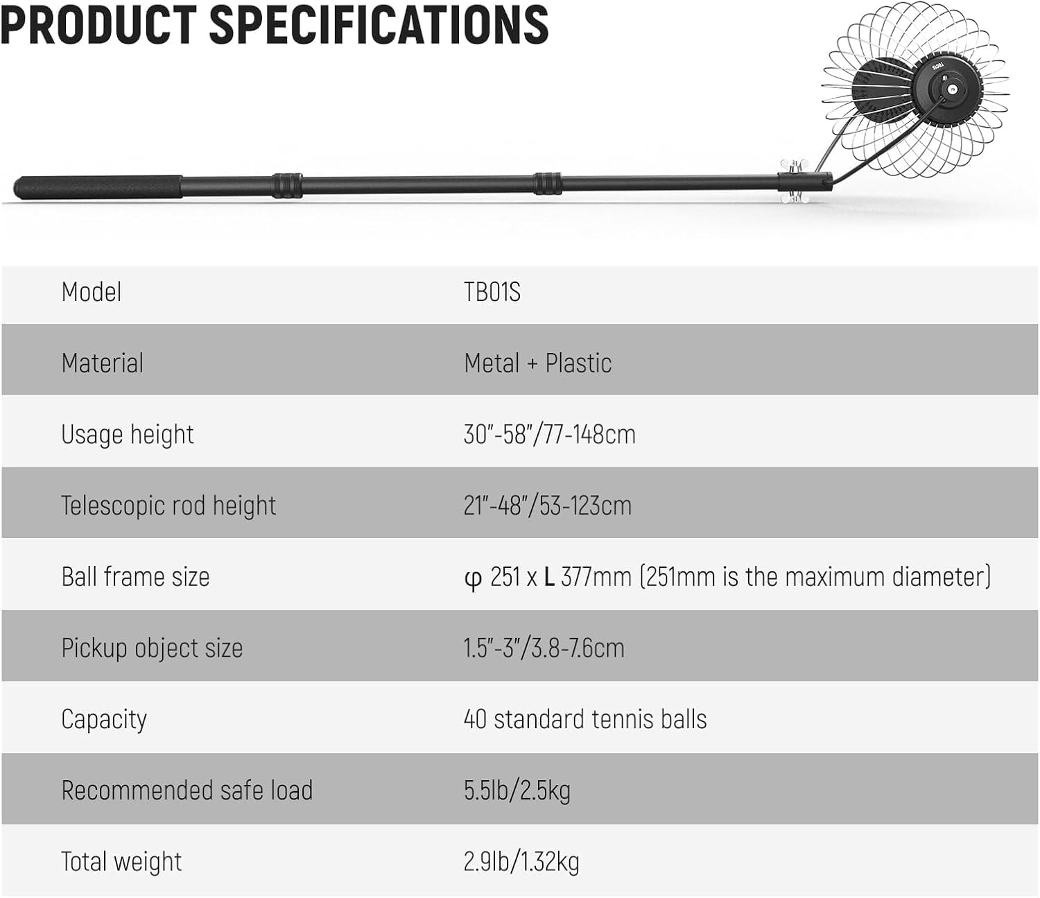 جمع کننده با ابعاد ۲۵ × ۳۸ سانتی متر (قطر ۹.۸ اینچ × طول ۱۵ اینچ) طراحی شده و ظرفیت نگهداری ۴۰ توپ استاندارد تنیس (۶۰–۶۸ میلی متر) را دارد. همچنین سیم های انعطاف پذیر آن امکان جمع آوری توپ های ۱.۵ تا ۳ اینچ مانند توپ پیکلبال، گلف و حتی آجیل های هم اندازه را فراهم می کنند. برای خارج کردن توپ ها کافیست سیم ها را به صورت دستی باز کنید.